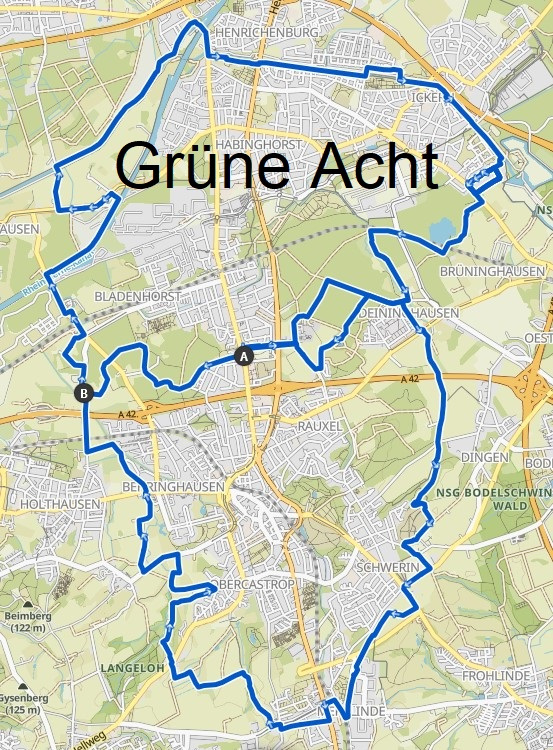 Die Grüne Acht. Eine Tour rund um Castrop - Rauxel. Insgesamt ist die Strecke ca. 43 km lang und hat einen Höhenanstieg von 220 Meter. Bei einer durchschnittlichen Geschwindigkeit von 13,6 km/h benötigt man ungefähr 3 Stunden und 6 Minuten.