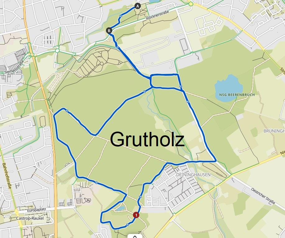 Dies ist die Route, die wir durch das Grutholz nehmen. Beginnend bei Getränkewelt auf der Lange Srasse, gehen wir durch den kleinen Wald über die Klöckner Strasse in das Grutholz. Die Strecke wird im Grutholz gut sichtbar markiert sein. Insgesamt ist die Strecke 10 Km lang und kann im Grutholz jeder